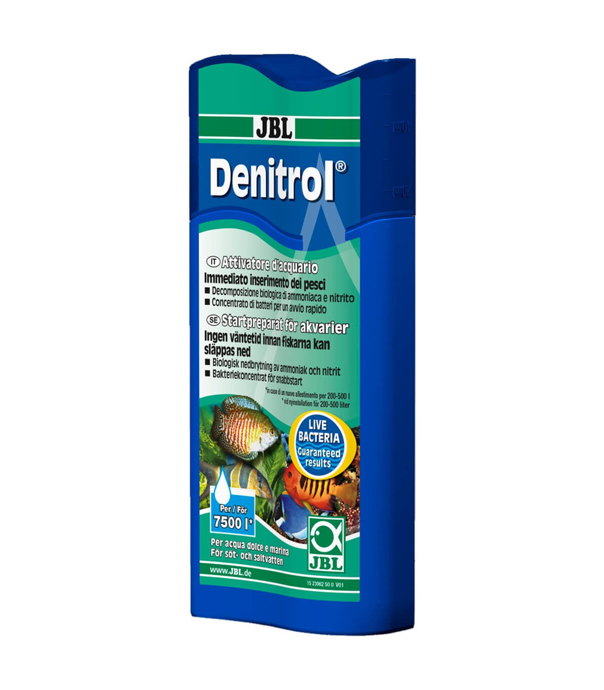 Si discute sempre della possibilità di inserire subito i pesci il giorno seguente all’allestimento del nuovo acquario. I microbiologi hanno osservato che i batteri in un nuovo acquario si riproducono lentamente se non c’è un certo inquinamento dell’acqua (nutrimento per i batteri). Se però si inseriscono i pesci il giorno dopo l’allestimento senza utilizzare un attivatore batterico, si hanno problemi con l’ammonio e l’ammoniaca perché i batteri all’inizio si riproducono troppo lentamente e non riescono a tenere il passo con gli inquinanti. Con JBL Denitrol (15 minuti dopo il JBL Biotopol) vengono aggiunte subito grandi quantità di batteri. Inserendo poi il giorno seguente i primi pesci, questi batteri ricevono cibo e cominciano a moltiplicarsi. Così si assicura che sin dall’inizio ci siano sufficienti batteri e che né l’ammonio/ammoniaca né il nitrito diventino un problema.
