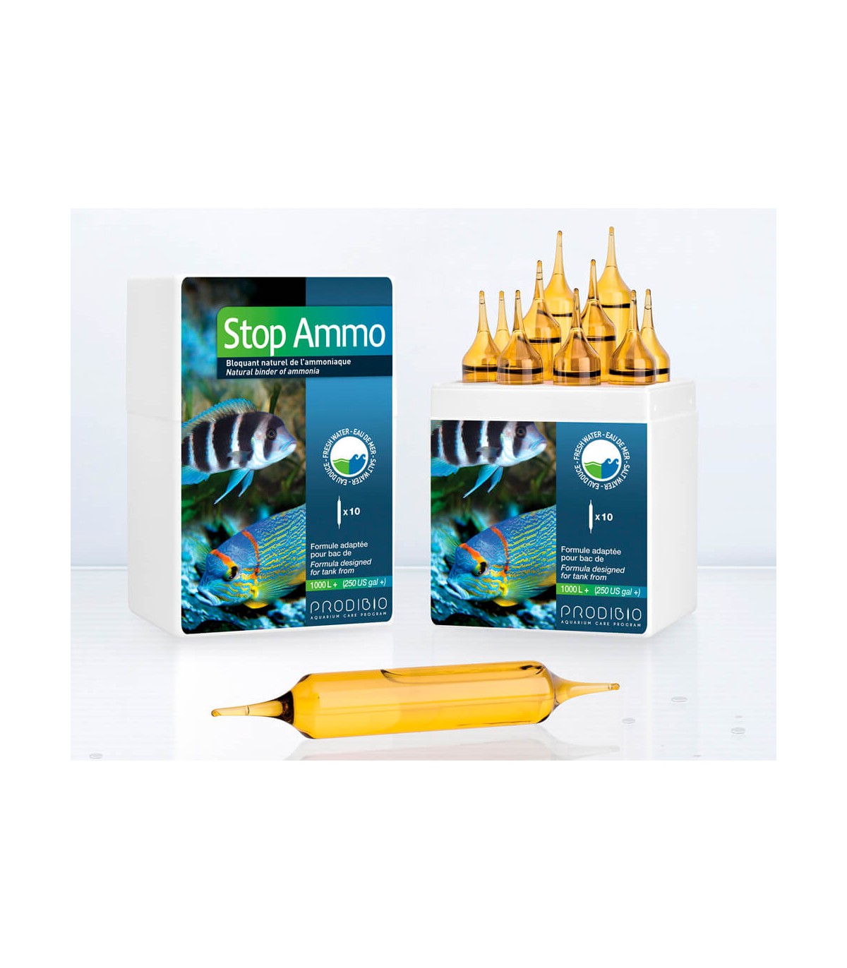 Stop_Ammo è efficace in acqua dolce e marina ed è un estratto vegetale naturale che neutralizza l'ammoniaca e riduce la produzione di nitriti negli acquari e nell'acqua utilizzata per il trasporto dei pesci.
